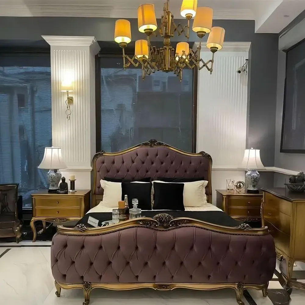 Luxury Baroque Style Deep Purple Tufted Velvet Bed with Gold Accents