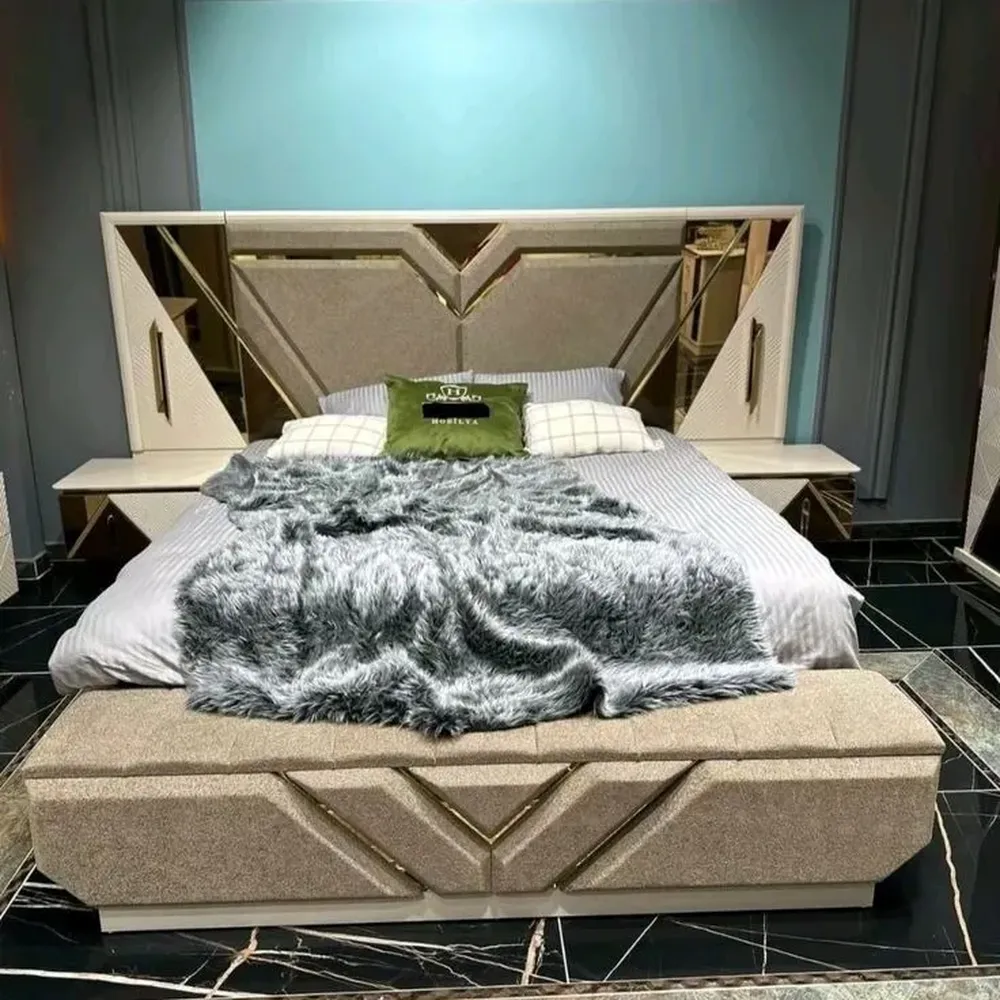 Luxury Turkish Grey Velvet Bed with Mirror Border Headboard