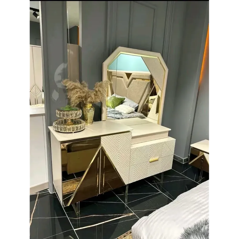 Luxury Turkish Grey & White Fabric Bed with Deco Gold Accents