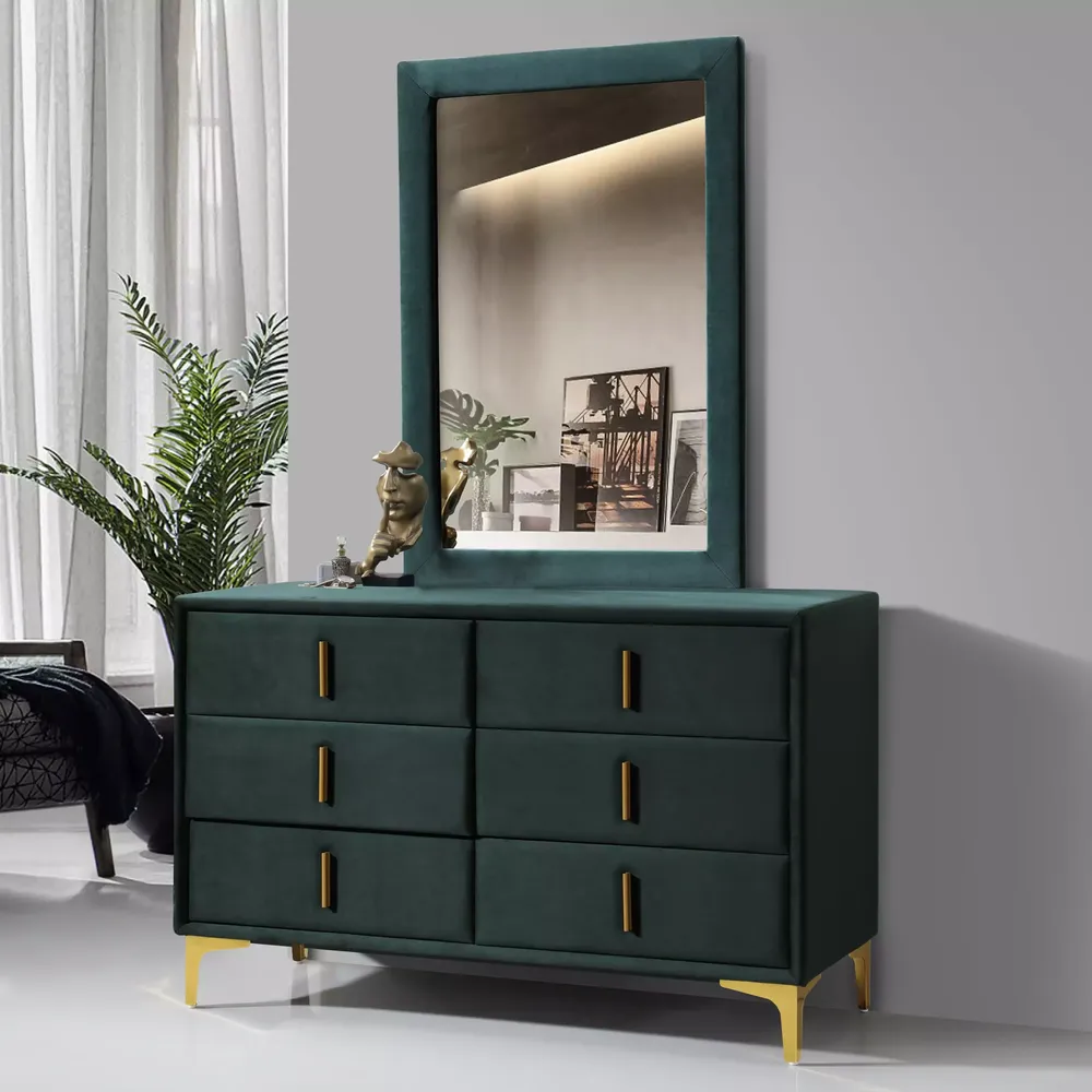 Emerald Green Turkish Velvet Dressing Table with Vertical Gold Accents & Large Mirror