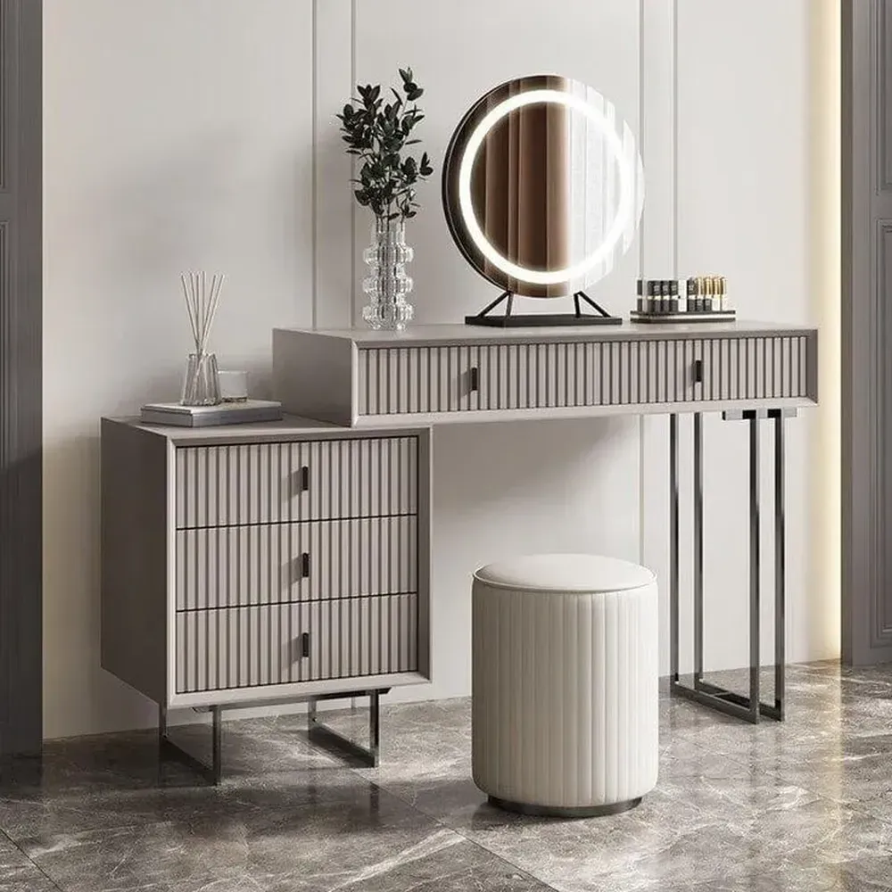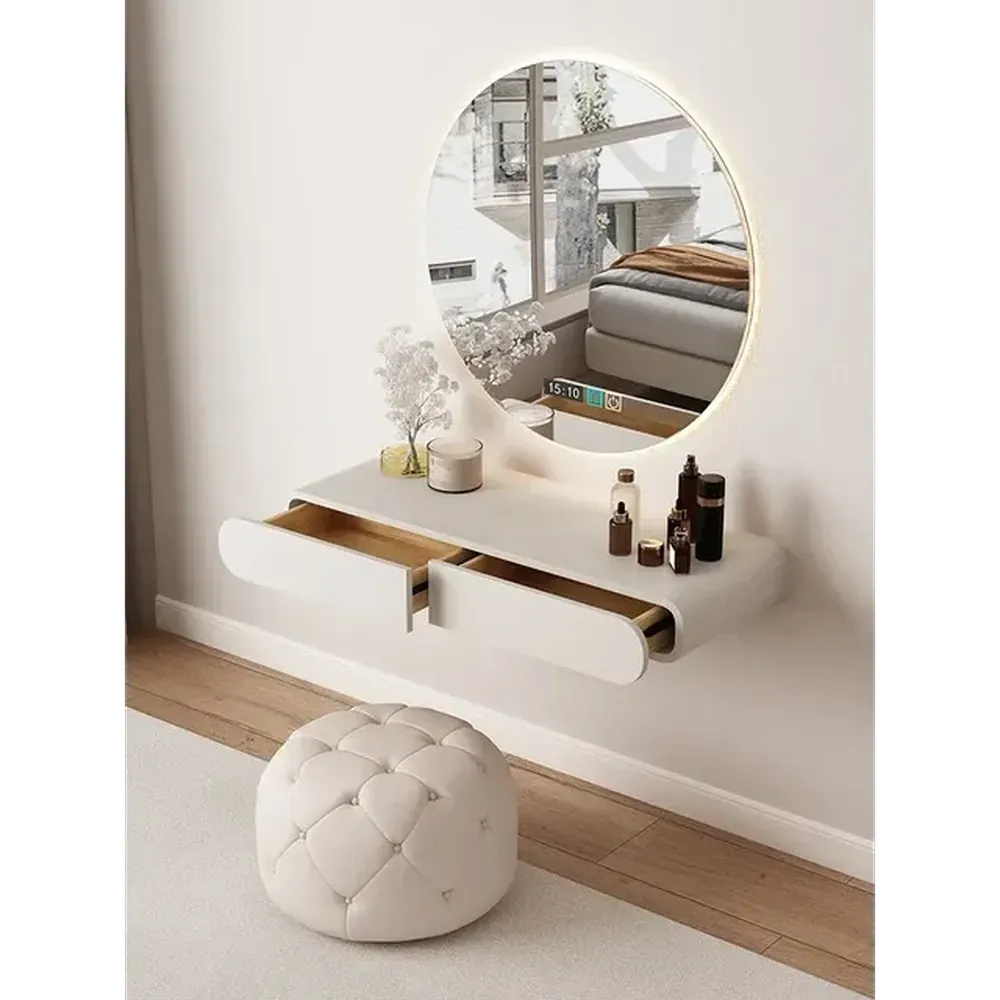 Modern Floating Dressing Table with Backlit Circular Mirror & Fluted Panels