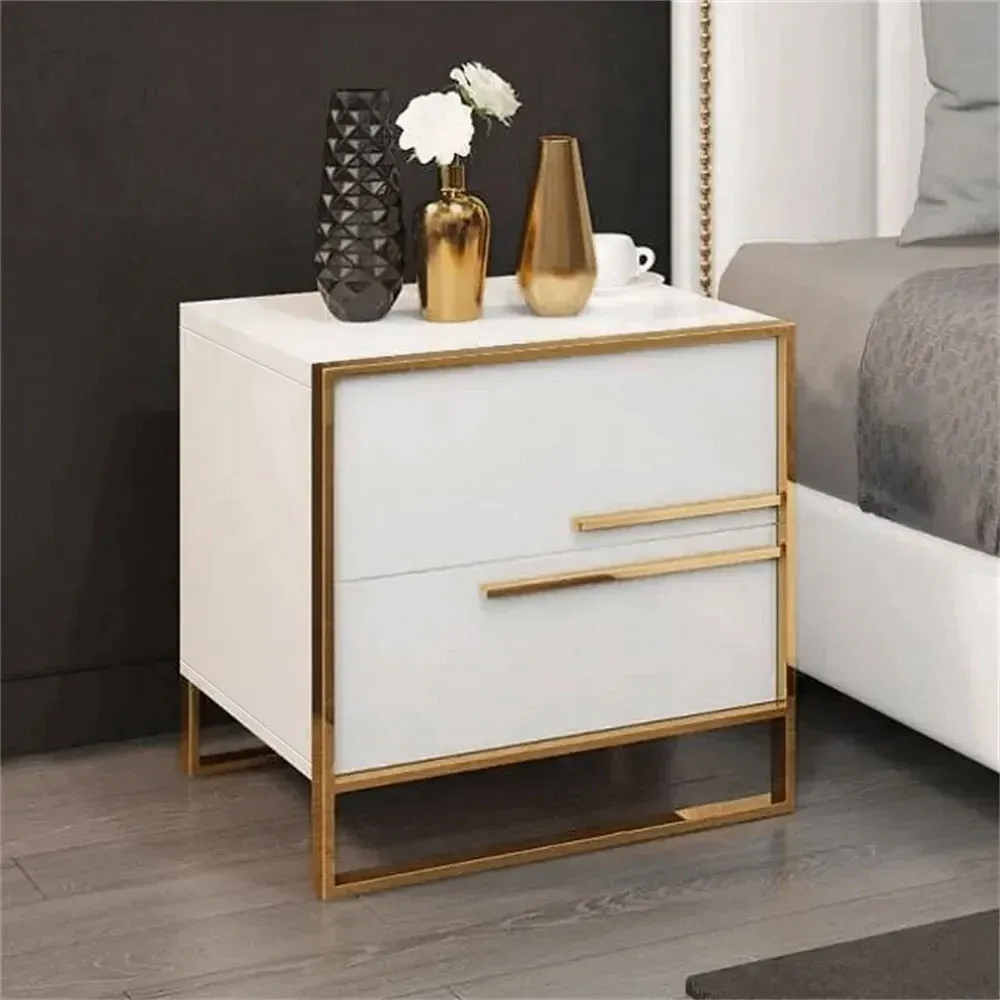 High-Gloss White & Gold Modern Nightstand with Curved Edges – 3 Drawer Design