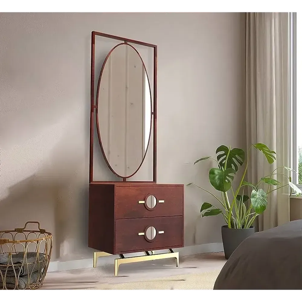 Classic Polish Brown Vanity Side Table with Oval Mirror