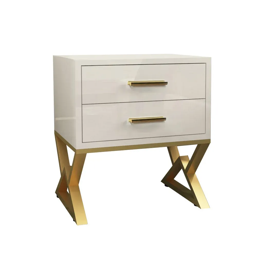 High Gloss White Side Table with Geometric Gold X-Base & Dual Storage Drawers