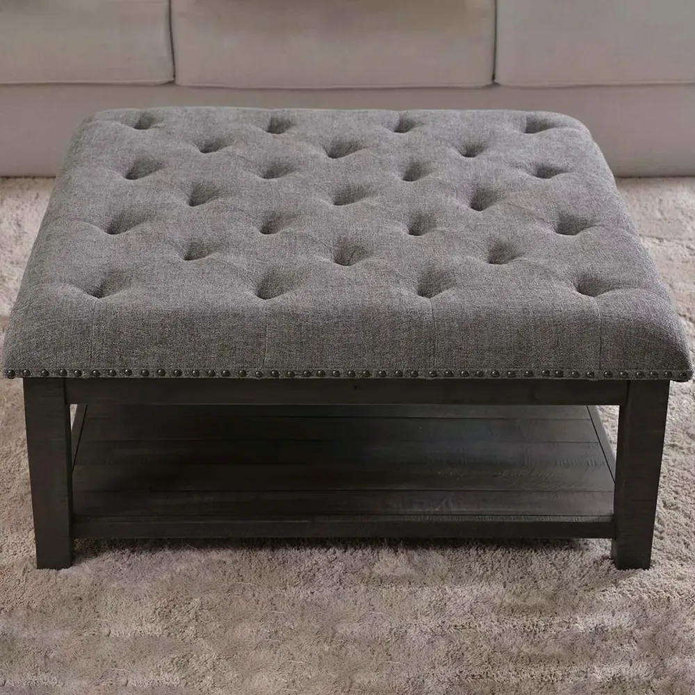 Classic Grey Jute Tufted Ottoman Coffee Table with Dark Wood Storage Shelf