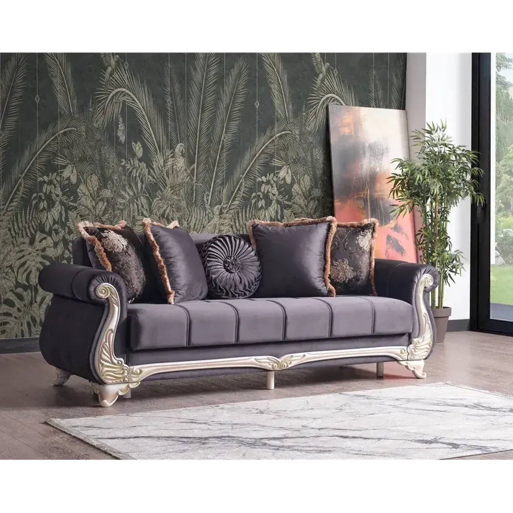 Charcoal Grey Velvet Sofa with Silver Leaf Scrolling