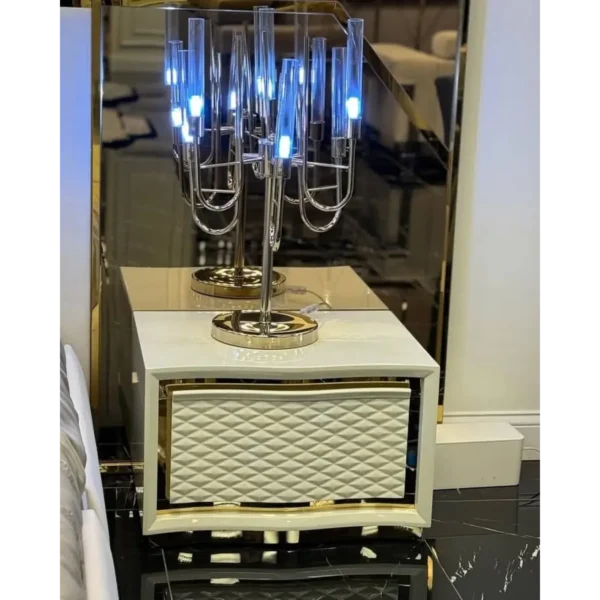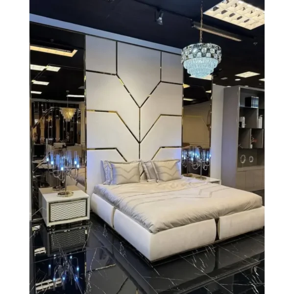 The Alabaster Royale defines modern opulence. Its striking white velvet headboard is accented by sharp gold V-shaped metal work, flanked by expansive mirrors that double the light and depth of your master suite.