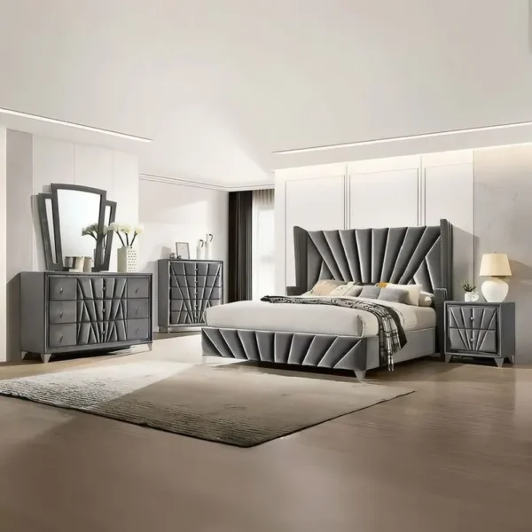 Art Deco Inspired Grey Velvet Bedroom Set with Geometric Sunburst Headboard – Luxury