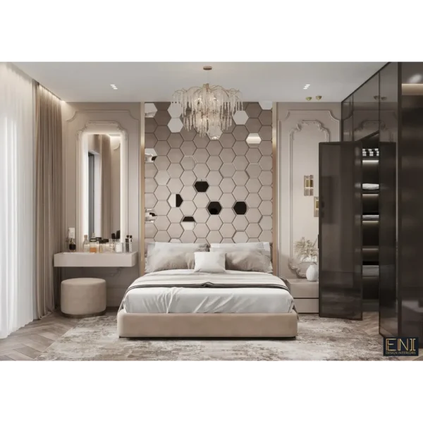 This sophisticated wall bed features a stunning floor-to-ceiling headboard with a honeycomb geometric pattern. Finished in soft beige velvet with gold accents, it includes a matching built-in vanity and ambient lighting for a complete master suite experience.