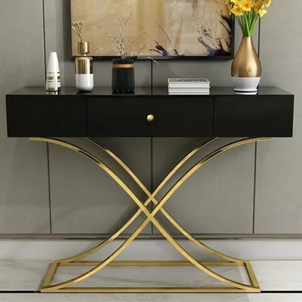 Elevate your living space with the Aurelius Minimalist Black Console Table with X-Shaped Gold Metal Base. The highlight is the dramatic, curved X-shaped metal base in a polished gold finish, offering a perfect blend of high-fashion design and everyday utility.. Transform your entryway or hallway with the Aurelius Console Table. This modern piece features a minimalist black rectangular top equipped with a functiol drawer An essential addition to your furniture collection.