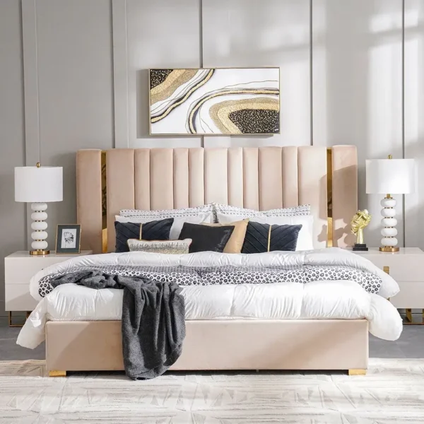 Beige Velvet Vertical Tufted Bed with Gold Trim & Marble Accents