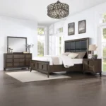 Elevate your living space with the Classic Dark Brown Polish Bed with Grey Fabric Inset. This classic bed frame features a rich dark brown polish and a comfortable grey fabric inset. Built-in drawers at the foot of the bed provide practical storage without sacrificing traditiol style and elegance. Built with quality materials to ensure lasting durability and style.