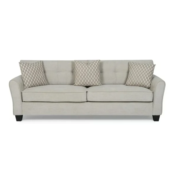The Classic Grey Fabric Sofa with Jute Accents and Black Trim is designed to bring a touch of class to any home. This classic fabric sofa combines traditiol charm with modern durability. The soft grey upholstery is accented by patterned throw pillows, making it a versatile centerpiece for any formal or casual seating area. An essential addition to your furniture collection.