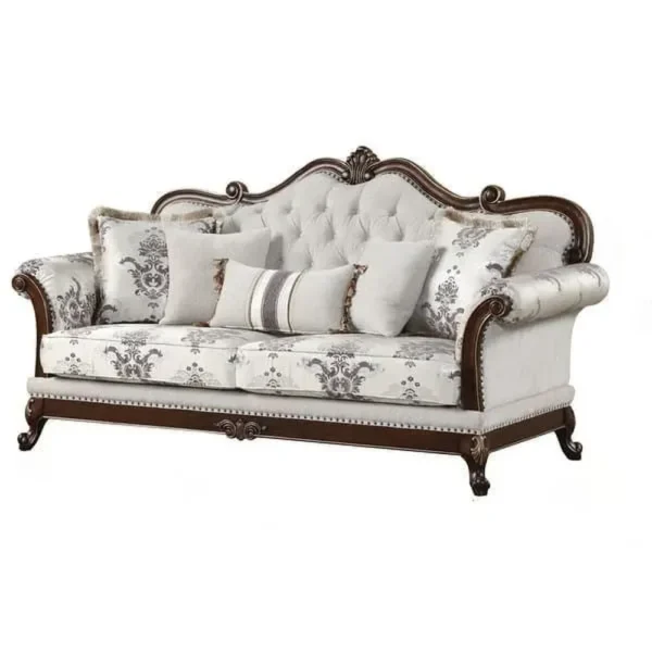 Classic Luxury White Fabric Wooden Sofa with Carved Dark Brown Frame