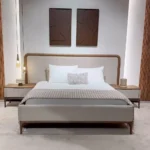 Elevate your living space with the Classic Minimalist Polish Fabric Bed in Dark Brown and Grey. Achieve a balanced look with this classic half-polish bed. The headboard features clean vertical fabric panels framed by rich dark brown wood. This set includes a matching dresser and nightstand, providing a serene and organized atmosphere. Built with quality materials to ensure lasting durability and style.