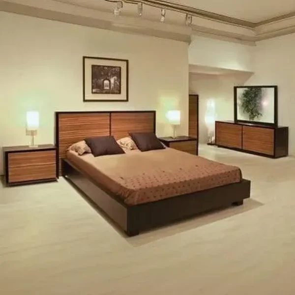Elevate your living space with the Vertical Grain Headboard and Nightstands Classic Two-Tone Polish Wood Bed. A masterpiece of traditiol woodworking, this bed showcases a beautiful contrast between dark brown borders and light brown wood grain panels. The low-profile design provides a modern touch to a classic polish finish, making it a versatile choice for any home decor. Ideal for those who appreciate fine craftsmanship and contemporary design.
