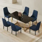This classic dining suite pairs a heavy marble tabletop with a rich dark brown wood finish. The six chairs feature elegant beige upholstery, making it a perfect centerpiece for formal dinner parties.