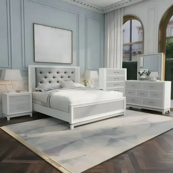 Elevate your living space with the Classic White and Silver Tufted Deco Bedroom Collection with Mirrored Accents. This classic deco bed set brings a bright and airy sophistication to your home. The headboard features plush grey velvet tufting framed by clean white lines and silver accents. The set includes a matching dresser, mirror, and chest, all showcasing a harmonious blend of traditiol craftsmanship and modern color palettes. Built with quality materials to ensure lasting durability and style.