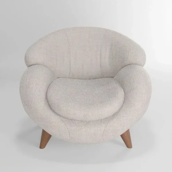 This modern accent chair features a unique “cloud” silhouette, blending organic curves with luxurious white velvet. The light brown polished wooden legs provide a sturdy, elegant base, making it a perfect statement piece for contemporary living rooms or cozy reading nooks.