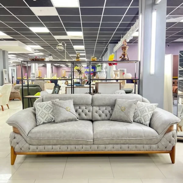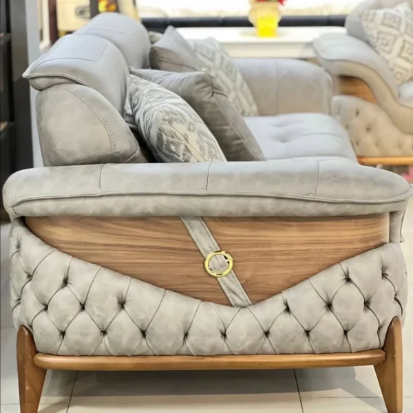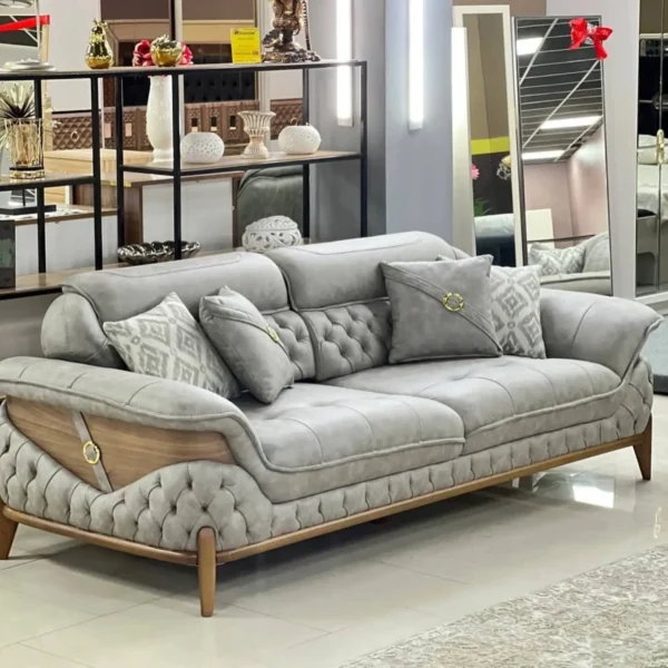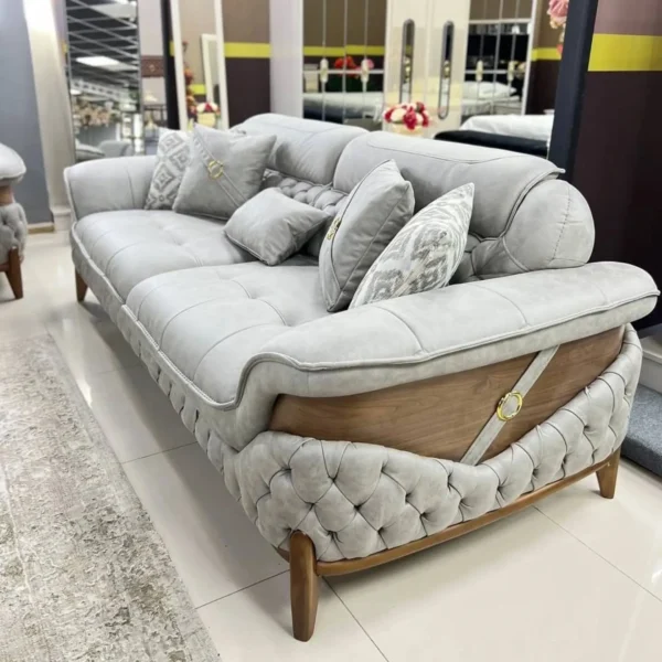 This grand Turkish suite offers expansive seating with a focus on detail. The light grey velvet is enhanced by intricate quilting and button-tufting on the sides, supported by elegant wooden legs for a timeless aesthetic.