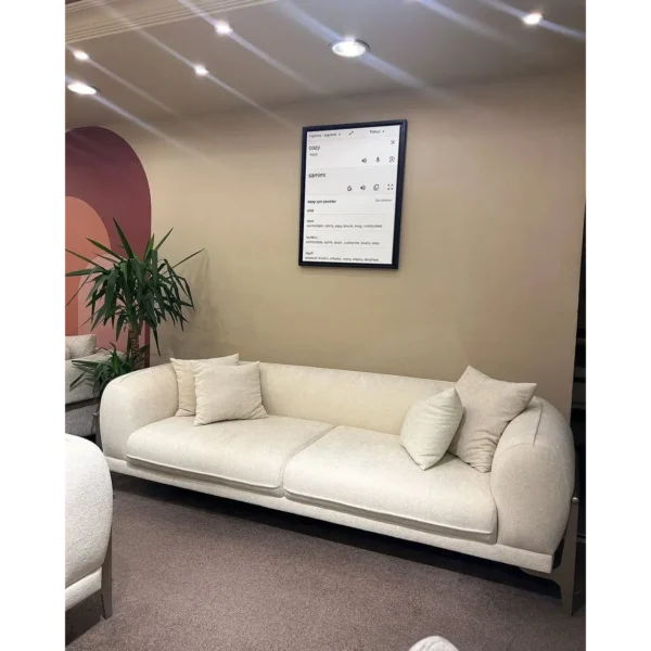 Experience the cozy texture of boucle with this innovative sofa. It features a continuous metallic frame that loops around the back and extends into a convenient, integrated side table for a seamless look.
