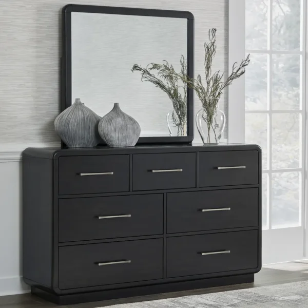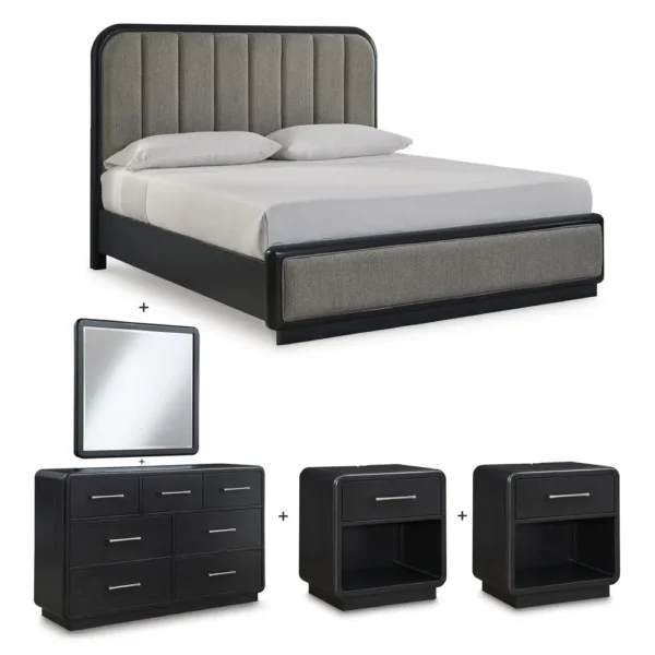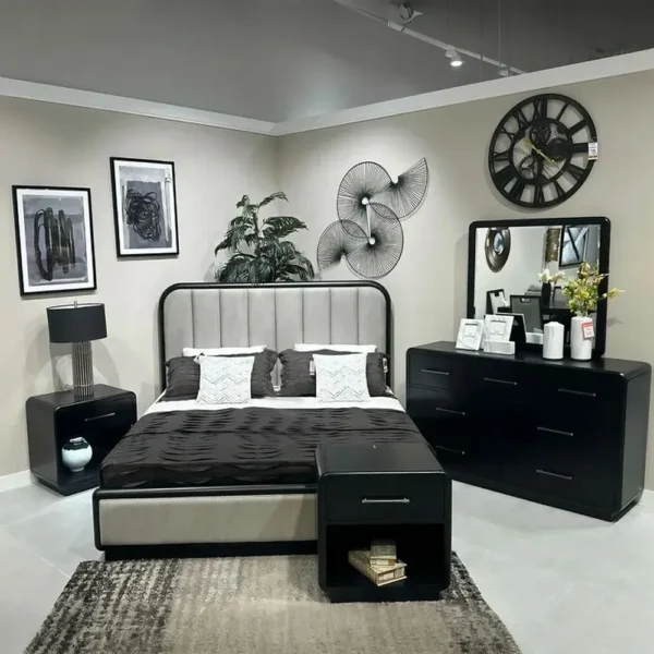The Contemporary Black and Grey Deco Bed with Vertical Tufted Headboard is designed to bring a touch of class to any home. This modern Deco Bed offers a bold, sophisticated aesthetic with its deep black frame and contrasting grey fabric headboard. The headboard features elegant vertical channel tufting, adding texture and height to the room. Designed with rounded corners and a low-profile silhouette, this bed is paired with matching black nightstands and a spacious dresser to create a cohesive, high-fashion bedroom environment. Built with quality materials to ensure lasting durability and style.