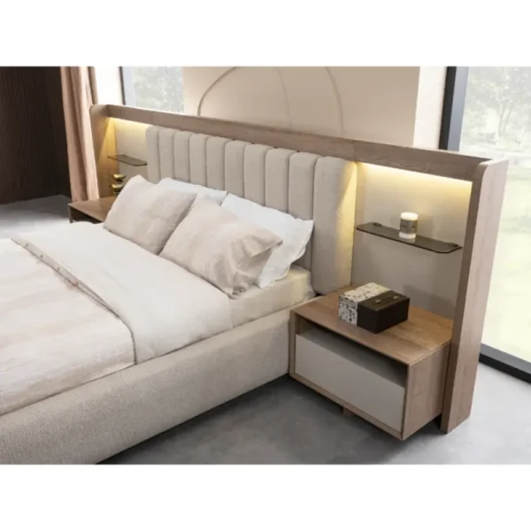 The Contemporary Grey Fabric Bed with Integrated LED Lighting is designed to bring a touch of class to any home. A high-tech take on modern comfort, this grey fabric bed features horizontal tufting on the headboard and soft, integrated LED strips for ambient lighting. The addition of brown wood-toned side shelves provides a convenient spot for your essentials, creating a functiol and stylish focal point for your bedroom. Built with quality materials to ensure lasting durability and style.