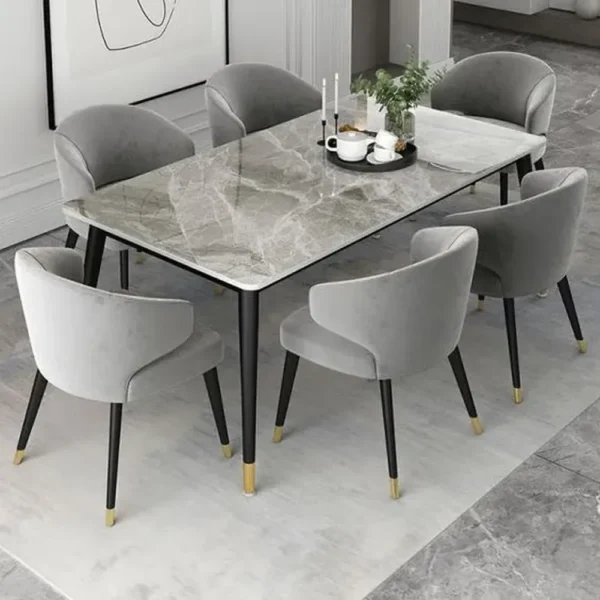 Contemporary Grey Marble Dining Table with Velvet Chairs – 6-Seater Set