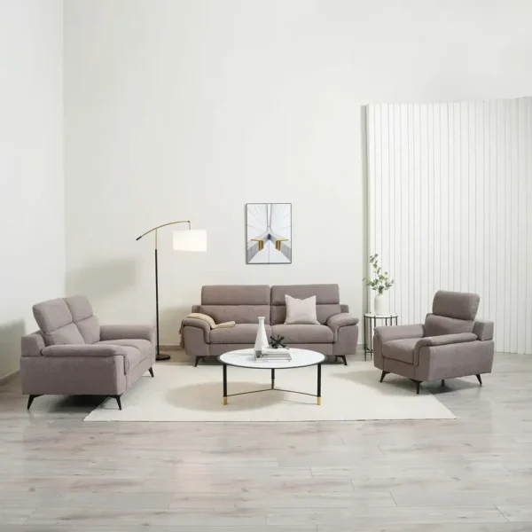 Contemporary Plush Grey Fabric Sofa with Adjustable Headrests & Slim Metal Legs