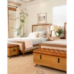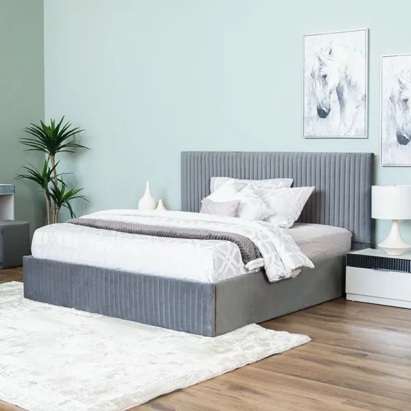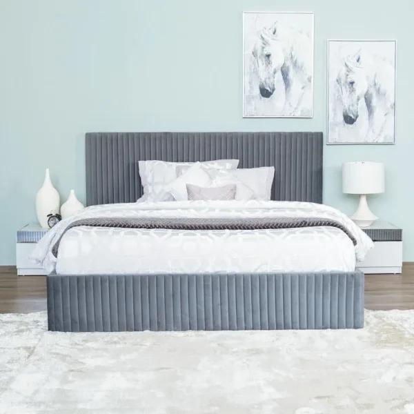 Elegant Grey Velvet Vertical Slat Bed with Matching Vanity Set – Modern Bedroom Suite