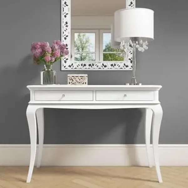 The Cabriole Legs and Twin Drawers Premium White French Provincial Console Table is designed to bring a touch of class to any home. The two drawers feature minimalist knobs for a clean, luxury look.. With its elegant cabriole legs and smooth white finish, it serves as a beautiful focal point for an entryway or hallway. This exquisite console table draws inspiration from French Provincial design Built with quality materials to ensure lasting durability and style.