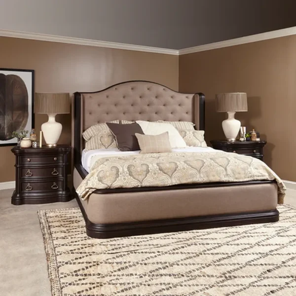 The Elite Luxury Upholstered Polish Bed in Dark Brown and Grey Jute is designed to bring a touch of class to any home. The arched, tufted headboard provides a grand silhouette, while the padded base ensures a seamless, high-end look for luxury interiors.. This masterfully crafted bed combines the warmth of dark brown wood polish with the texture of grey jute fabric A perfect blend of form and function for the modern home.