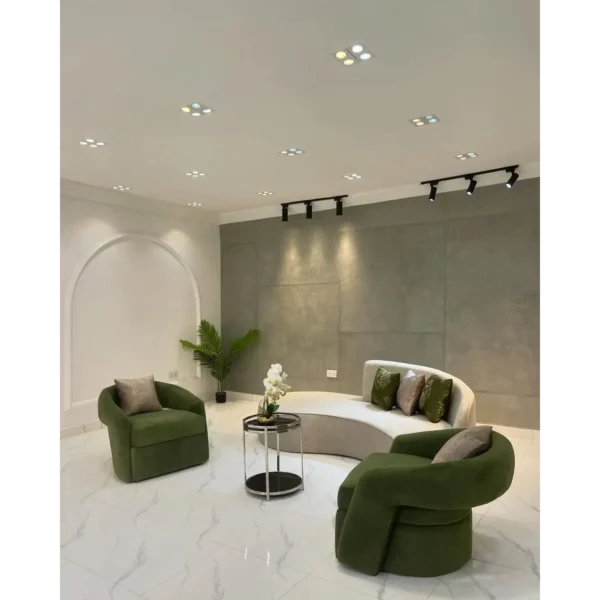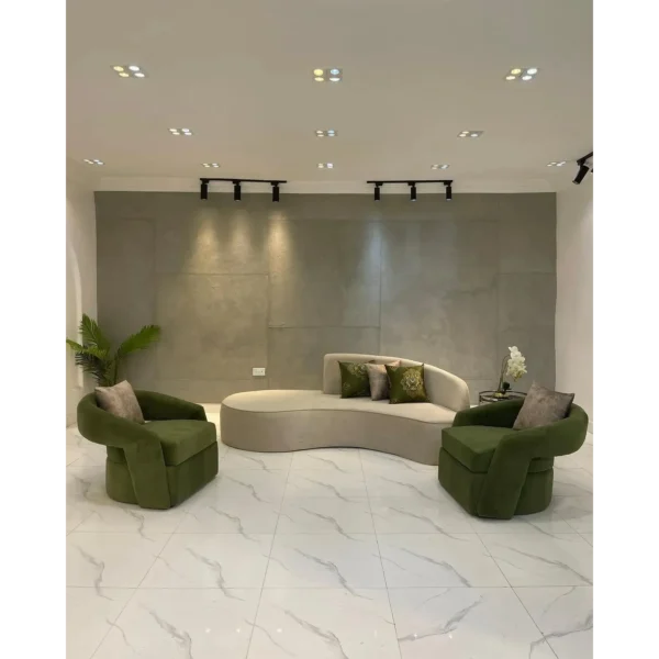 This modern set features a uniquely curved chaise-style sofa paired with two deep-seated emerald green velvet armchairs. The minimalist lines and rich textures create a sophisticated focal point for any contemporary living space.