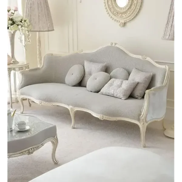This French-style sofa offers a tactile experience with its high-quality grey jute upholstery. The antique white polished frame features delicate curves that bring a soft, romantic feel to any room.