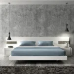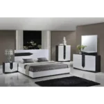 Bold contrast meets abstract art in this monochrome bedroom set. The headboard features faceted white panels with hidden LED strips, framed by a thick, high-gloss black border.
