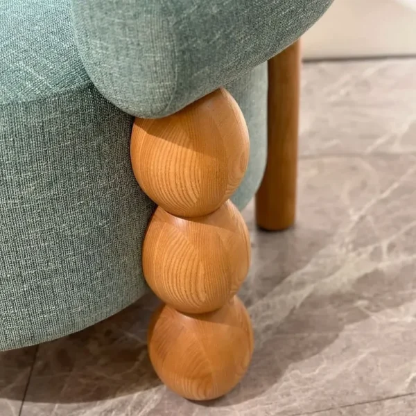 This avant-garde piece turns furniture into art. With its playful stacked sphere legs and cylindrical bolsters, this chair is upholstered in a durable green fabric. It’s an ideal choice for those looking to add a whimsical yet modern touch to their decor.