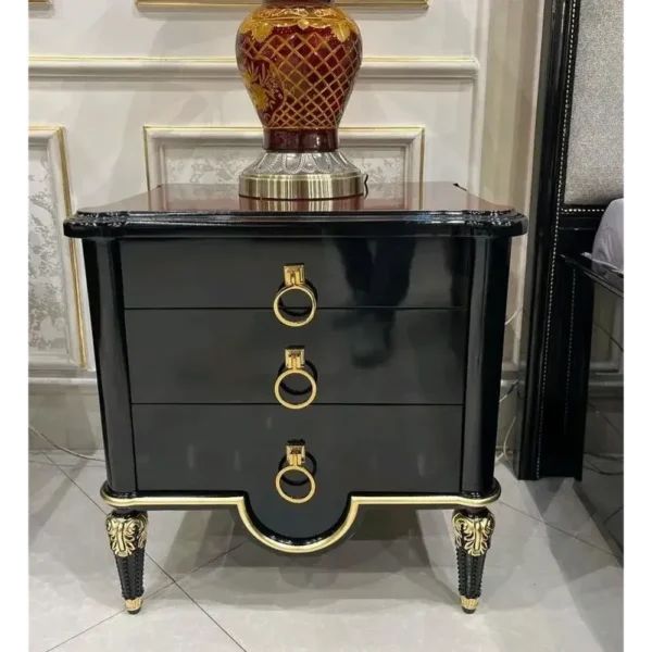 Elevate your living space with the Grand Luxury Baroque Style Black and Gold Carved Bedroom Set with Silver Upholstery. Elevate your bedroom to a palace-like setting with this luxurious deco bed. The frame is finished in a high-gloss black with intricate gold carvings on the headboard and footboard. The central panels are upholstered in a shimmering silver fabric, creating a high-contrast, regal aesthetic that defines opulence. Built with quality materials to ensure lasting durability and style.