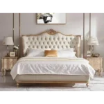 This grand black velvet bed commands attention with its high-profile headboard and opulent gold leaf baroque carvings. The deep onyx fabric provides a dramatic backdrop for the intricate gilded detailing.