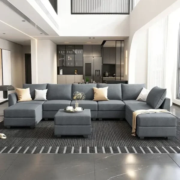 The Graphite Cloud is the perfect hub for family gatherings. This simple yet sophisticated U-shaped sofa features soft grey velvet and includes a matching central ottoman for versatile use.