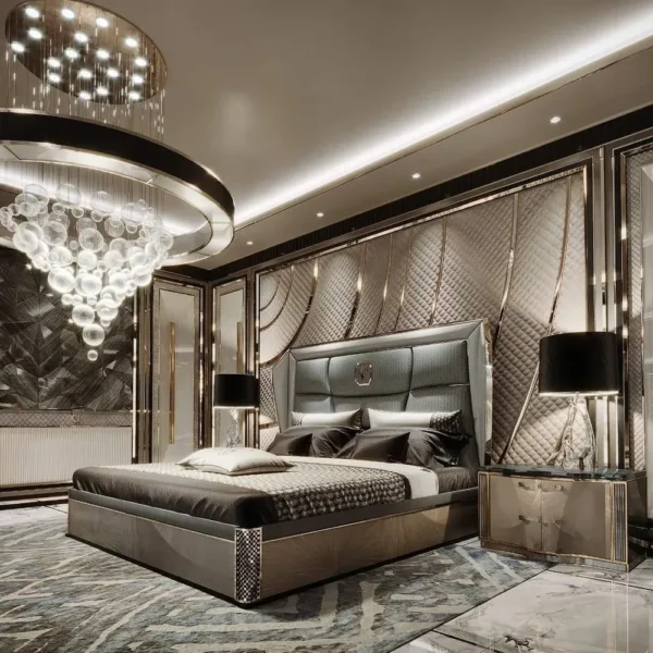 The Graphite Empire is a masterclass in texture. Combining deep diamond quilting with reflective silver accents, this Turkish-designed wall bed creates a dramatic, cinematic backdrop for the most prestigious bedrooms.