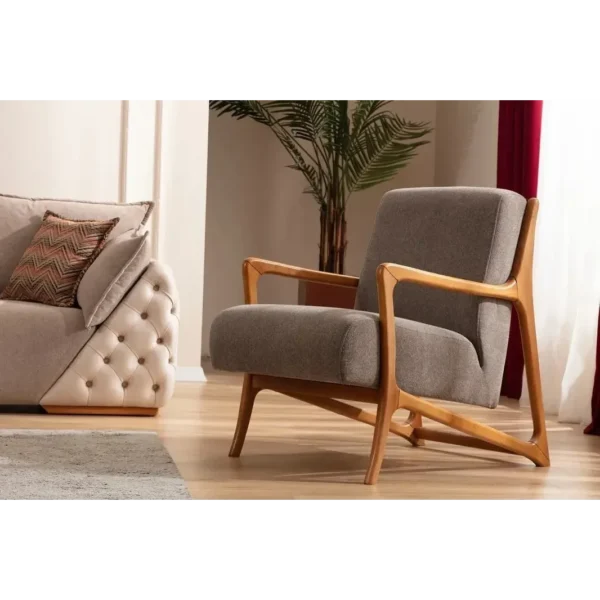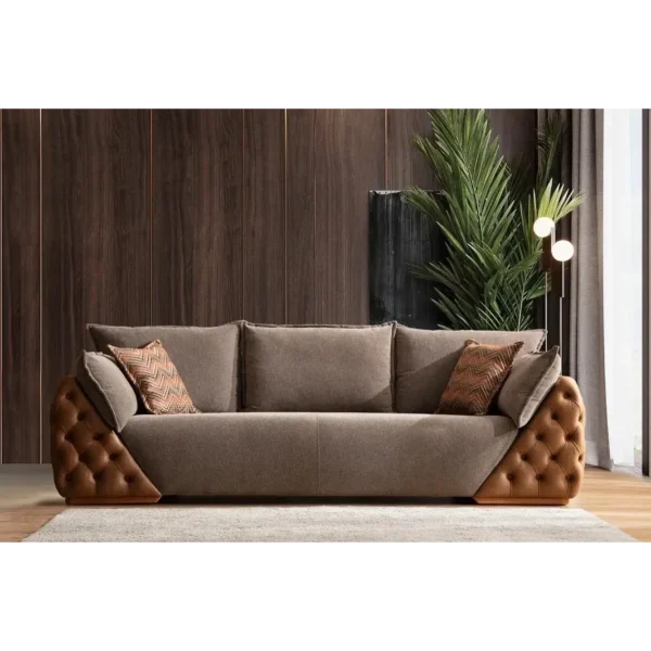 This luxury sofa combines traditiol tufting with modern proportions. The beige leather-rite and velvet textures are framed by dark wood accents, making it an ideal choice for large, upscale living rooms.