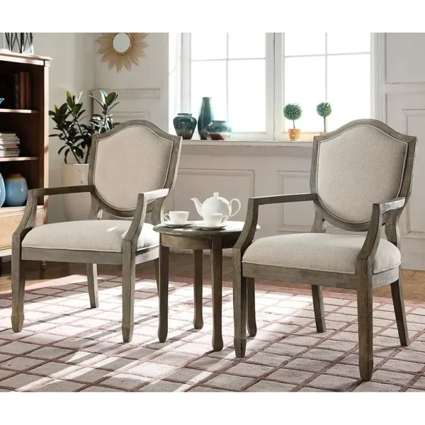 Elevate your home with these classic French-inspired armchairs. The weathered wood frame features elegant curves and shield-shaped backs, paired with neutral upholstery to bring a sophisticated, antique charm to your decor.