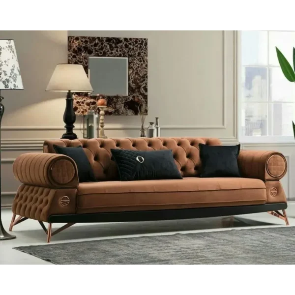 A modern take on a classic, the Heritage sofa features deep diamond tufting and a rich chocolate velvet finish. The striking rose gold metal legs add a touch of contemporary glamour to this traditiol silhouette.