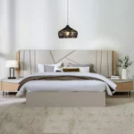 The Horizon Wall Bed utilizes verticality to create a sense of space. Its beige velvet headboard is divided by sharp, asymmetric silver inlays, creating a modern geometric look that functions as both a bed and a feature wall.