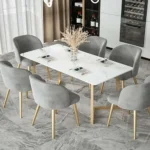 This Turkish-inspired oval dining set features beautiful fluted pedestals and a white marble top. The cream velvet chairs add a layer of texture and comfort to the refined design.
