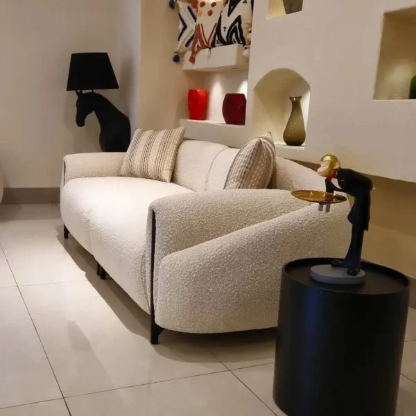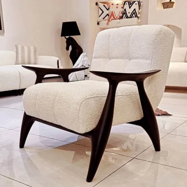 This Modern Fabric Sofa set features a trending white boucle finish that brings a tactile, cozy feel to your home. The deep dark brown polished accents provide a sharp contrast, highlighting the organic, curved shapes of the seating.
