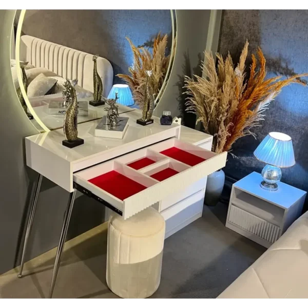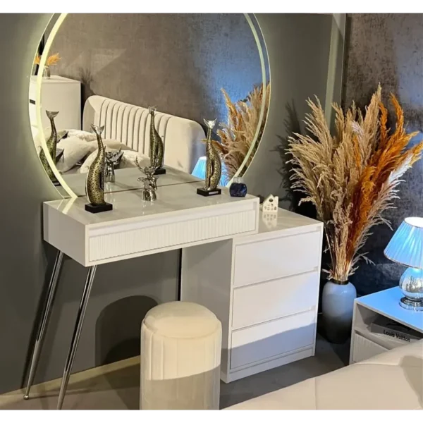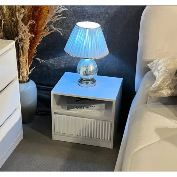 A masterpiece of modern geometry, this white velvet bed features consistent vertical fluting across the headboard and base. The clean lines and plush fabric offer a crisp, bright, and upscale bedroom look.