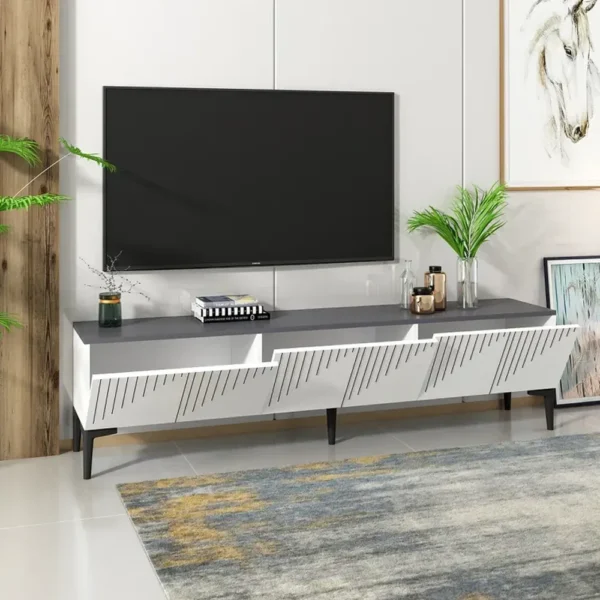 A masterpiece of modern design, this LCD floor unit features a striking geometric pattern of black lines against a crisp white finish. Its long profile offers ample storage while maintaining a sleek, artistic look.