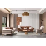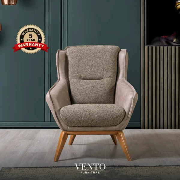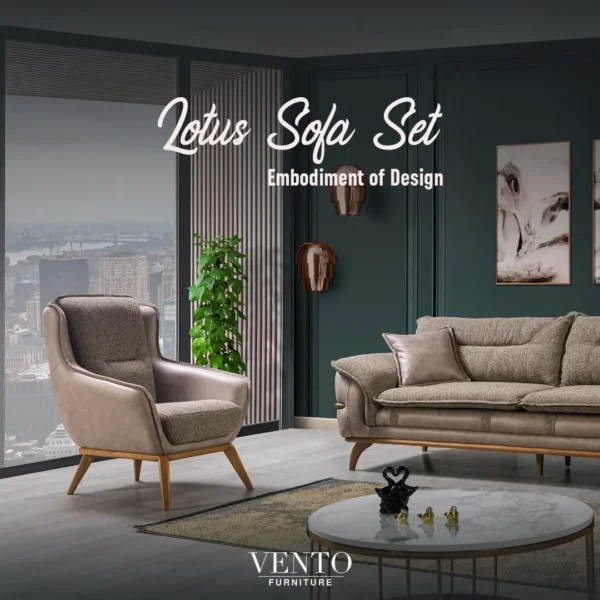 Part of the Vento collection, the Lotus sofa set features a rich mix of textured boucle and smooth accents. The earthy brown tones and high-back wing chair create a sophisticated, cozy environment for formal lounging.