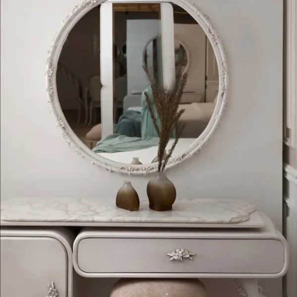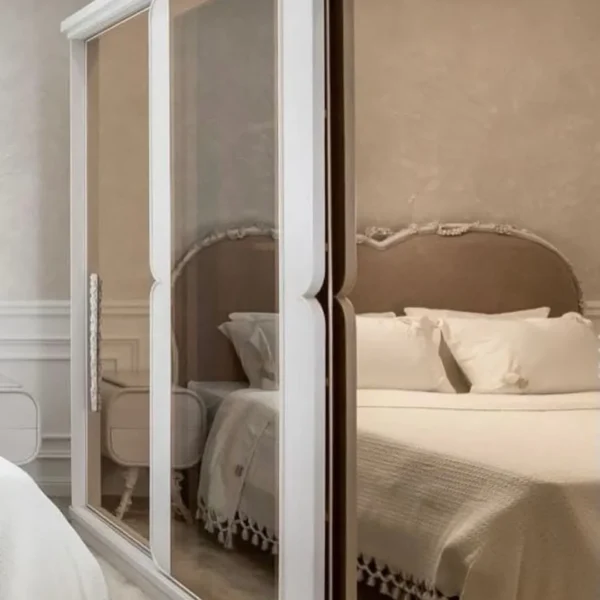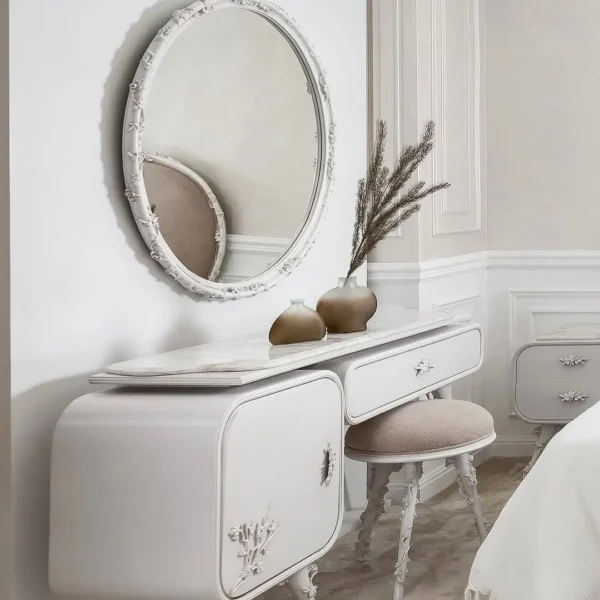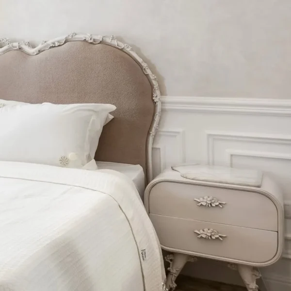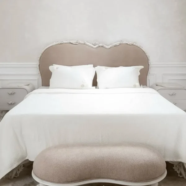 Inspired by royal silhouettes, this luxury beige velvet bed features a beautiful heart-shaped scalloped headboard. The frame is finished with intricate white floral carvings, paired with a matching plush kidney-shaped bench.